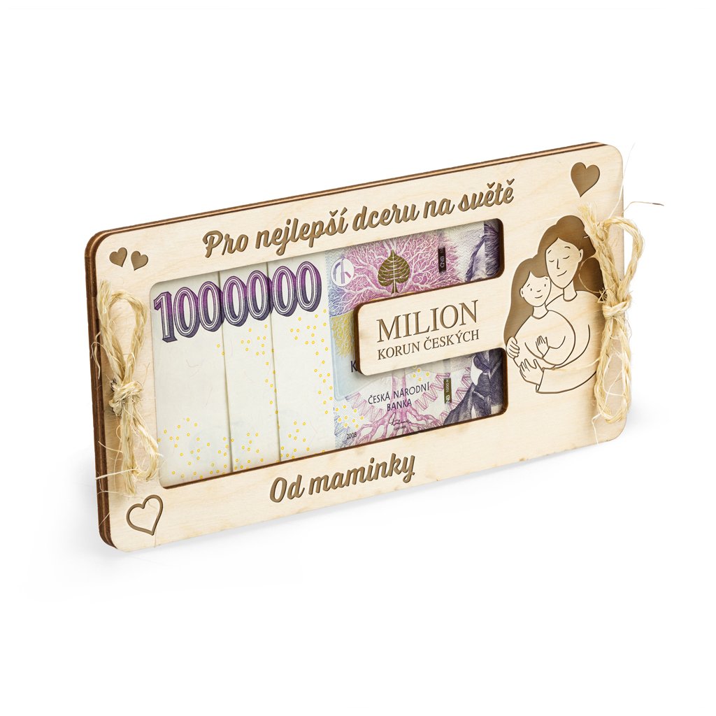 Dopřejte své dceři něco výjimečného! Toto originální dřevěné pouzdro je ideálním způsobem, jak darovat peníze s nápadem a humorem. Stačí složit bankovky tak, aby čísla vytvořila milion korun, nebo ji obdarujte libovolnou částkou.