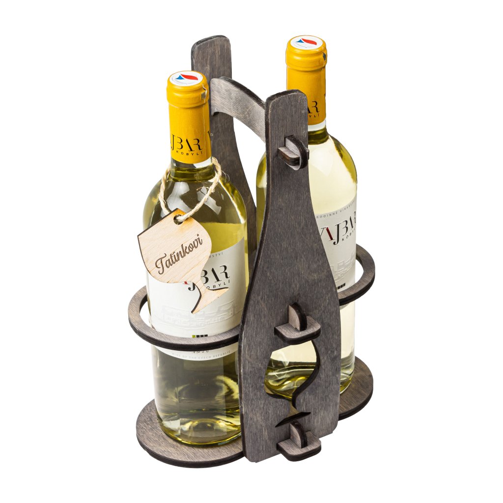 Dřevěný dárkový nosič na 2 vína s visačkou ve tvaru láhve, Šedá